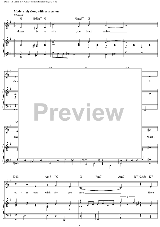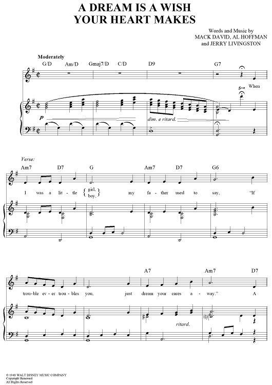 Digital Sheet Music for A Dream Is A Wish Your Heart Makes by Jerry Livingston, Mack David, Al Hoffman scored for Piano/Vocal/Chords; id:112858