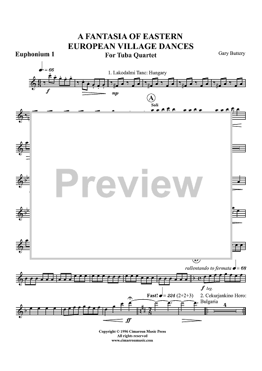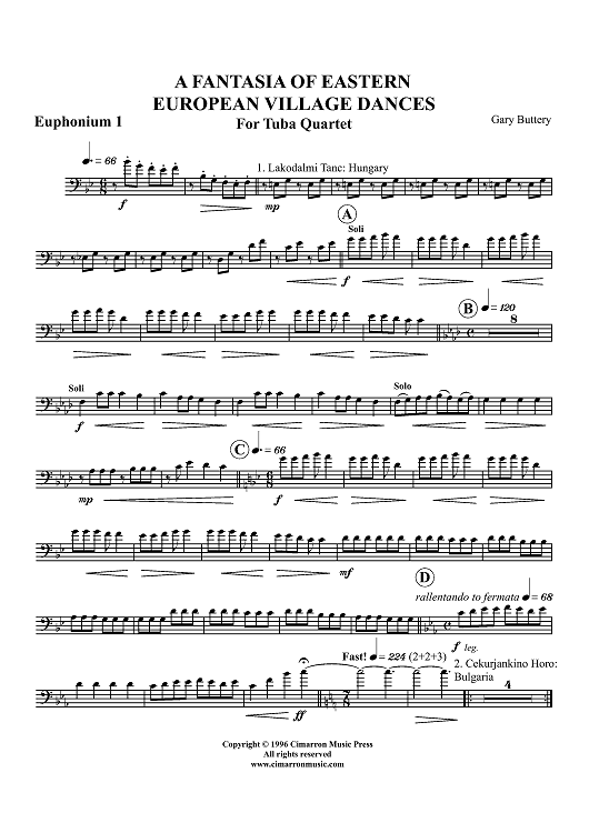 Digital Sheet Music for A Fantasia of Eastern European Village Dances - Euphonium 1 BC/TC by Gary Buttery scored for Tuba Quartet; id:319463