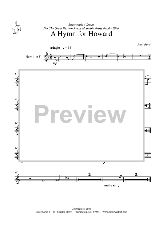 Digital Sheet Music for A Hymn for Howard - F Horn 1 by Paul Bara scored for Brass Ensemble; id:358049