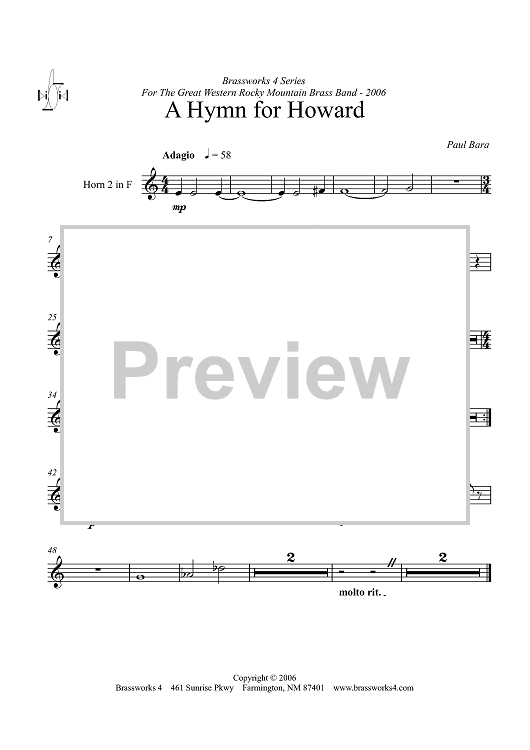 Digital Sheet Music for A Hymn for Howard - F Horn 2 by Paul Bara scored for Brass Ensemble; id:358050