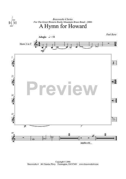 Digital Sheet Music for A Hymn for Howard - F Horn 3 by Paul Bara scored for Brass Ensemble; id:358051