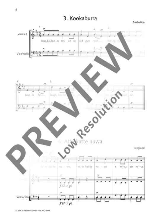 'The World Tour' has emerged from the practical work with a budding children's orchestra. The collection consists of both well-known songs and songs from the children's home countries. It is suitable as a first introduction into chamber music playing. By using different techniques (pizzicato, con sordino, solo and tutti), a colourful string orchestra setting is created which forms a beautiful sound image for a children's orchestra. To enable the children to grasp the melodic parts as songs, the song text has been added, whenever possible.