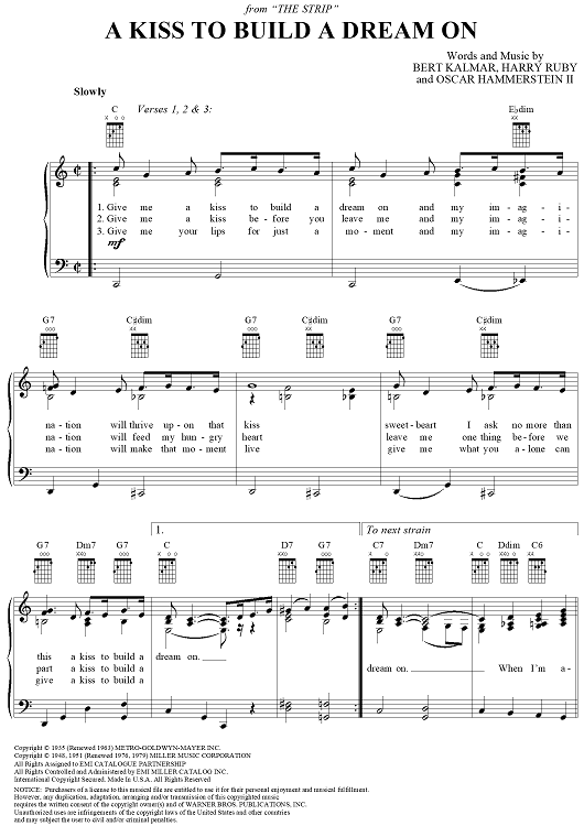 Digital Sheet Music for A Kiss to Build a Dream On by Bert Kalmar, Harry Ruby, Oscar Hammerstein II scored for Piano/Vocal/Chords; id:249794