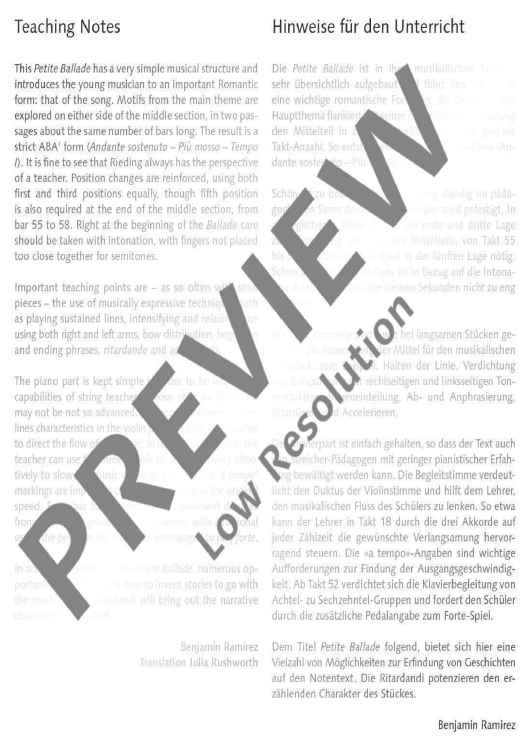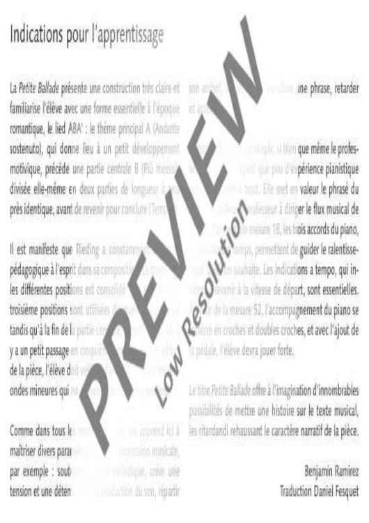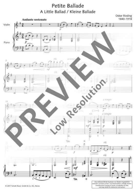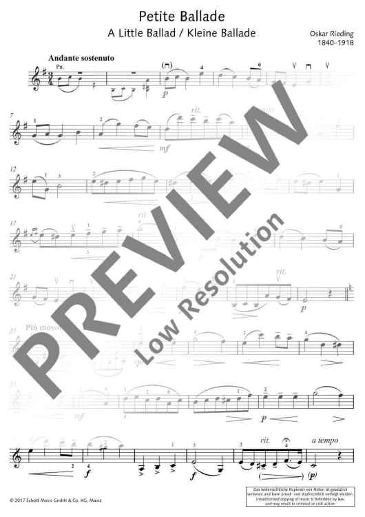 Among violinists and teachers, Oskar Rieding (1840-1918) is mainly known for his easily playable violin concertos especially for beginners. His beautiful pieces thrive on charming aesthetics which delight children of every age, teachers and audiences alike. Petite Ballade is part of the new Schott Student Edition series which offers varied literature at five different levels of difficulty, from 1 (easy) to 5 (difficult), for instrumental lessons: In print or electronic format Available as printed editions or PDF download Practising – efficiently and with pleasure Accompanying tracks of the pieces available as downloads