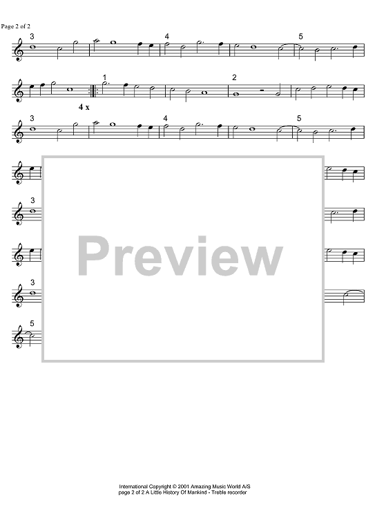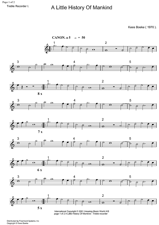 Digital Sheet Music for A Little History of Mankind - Recorder 1 by Kees Boeke scored for 40 Recorders; id:323034