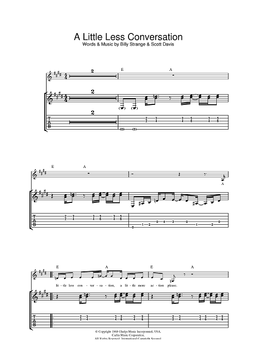 Digital Sheet Music for A Little Less Conversation by Elvis Presley, Mac Davis, Billy Strange scored for Guitar Tab; id:384032