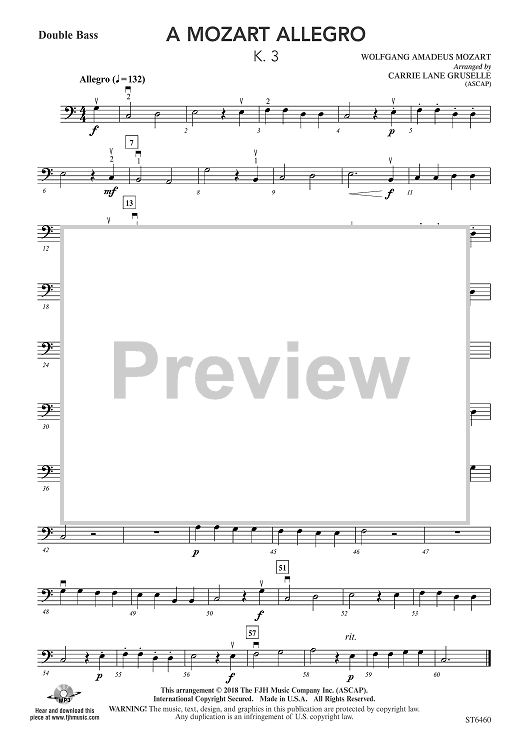 Digital Sheet Music for A Mozart Allegro K.3 - Double Bass by Wolfgang Amadeus Mozart, Carrie Lane Gruselle scored for String Orchestra; id:506715