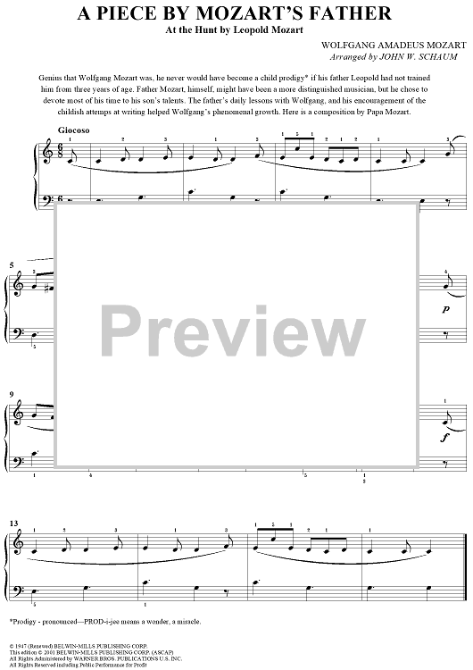 Digital Sheet Music for A Piece By Mozart's Father (At the Hunt by Leopold Mozart) by Wolfgang Amadeus Mozart, John W. Schaum scored for Piano Solo; id:293127