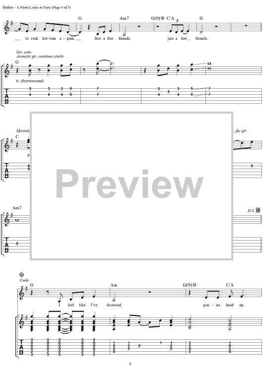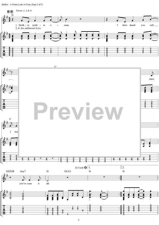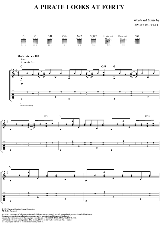 Digital Sheet Music for A Pirate Looks at Forty by Mike Taylor, Jimmy Buffett scored for Guitar Tab/Vocal; id:285440