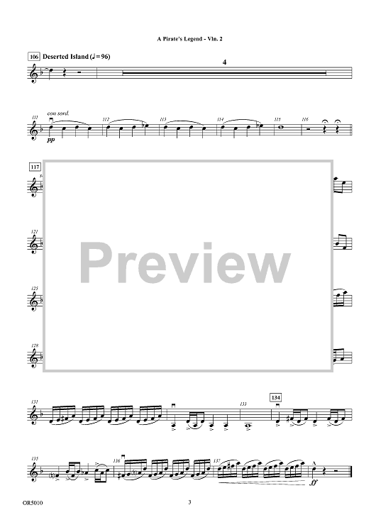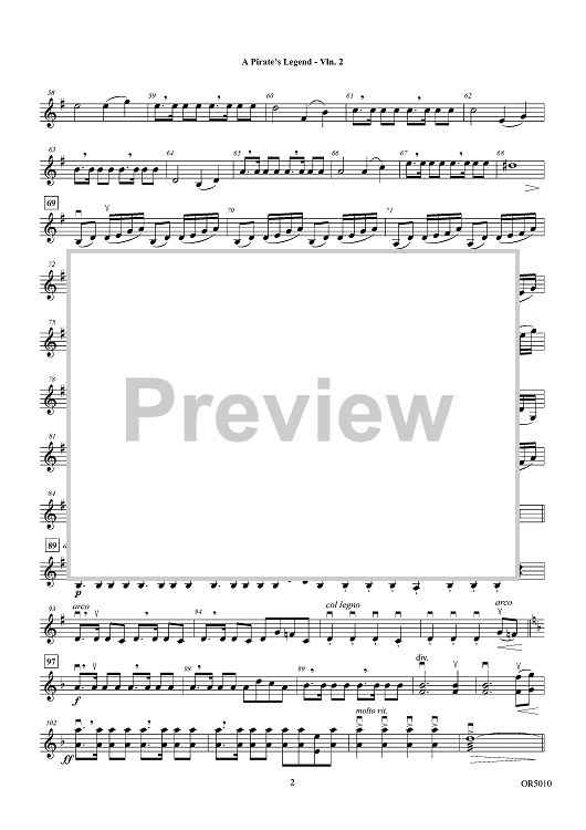 Digital Sheet Music for A Pirate's Legend - Violin 2 by Soon Hee Newbold, Carl Rydlund scored for Orchestra; id:446899