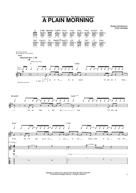 Digital Sheet Music for A Plain Morning by Chris Carrabba, Dashboard Confessional scored for Guitar Tab; id:391077