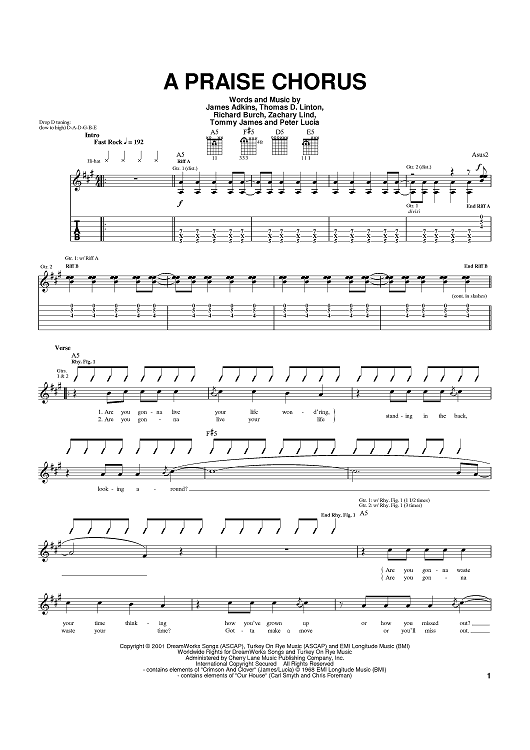 Digital Sheet Music for A Praise Chorus by James Adkins, Richard Burch, Jimmy Eat World, Tom Linton scored for Guitar Tab; id:369852
