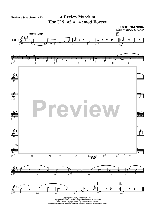 "A Review March to The U.S. of A. Armed Forces - Baritone Sax" Sheet Music by Henry Fillmore