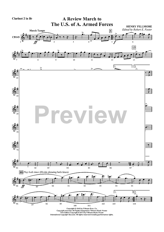 Digital Sheet Music for A Review March to The U.S. of A. Armed Forces - Clarinet 2 in Bb by Henry Fillmore, Robert E. Foster scored for Concert Band; id:435475
