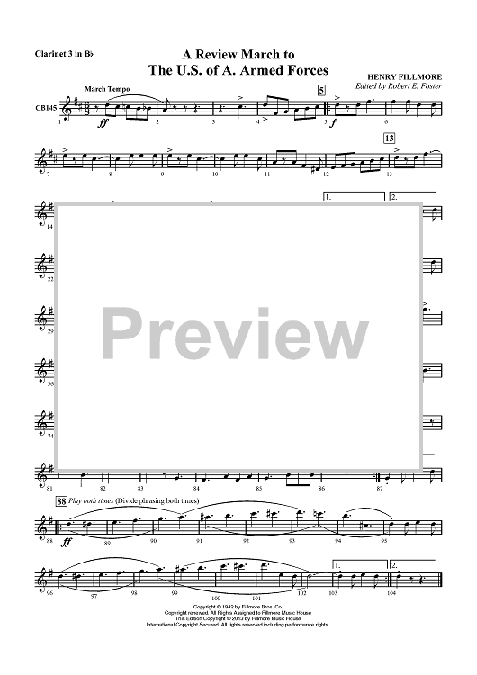 Digital Sheet Music for A Review March to The U.S. of A. Armed Forces - Clarinet 3 in Bb by Henry Fillmore, Robert E. Foster scored for Concert Band; id:435476
