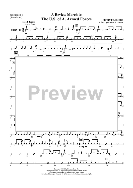 Digital Sheet Music for A Review March to The U.S. of A. Armed Forces - Percussion 1 by Henry Fillmore, Robert E. Foster scored for Concert Band; id:435497