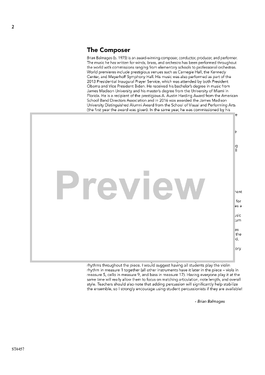 Opening with a thriving energetic rhythm, this exciting piece features a dance-like, memorable melody that will stay with the listener long after this celebration is over! Moving through simple meter changes that create additional momentum, the various sections include moments of slight restrain contrasted with carefree child-like fun. Get ready to experience the soundtrack of one giant celebration! (3:00)