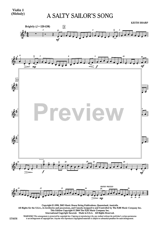 Digital Sheet Music for A Salty Sailor's Song - Violin 1 (Melody) by Keith Sharp scored for String Orchestra; id:505886