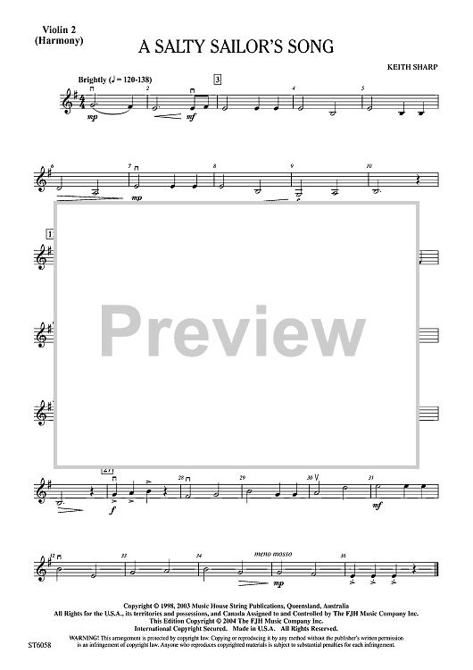 "A Salty Sailor's Song - Violin 2 (Harmony)" Sheet Music by Keith Sharp