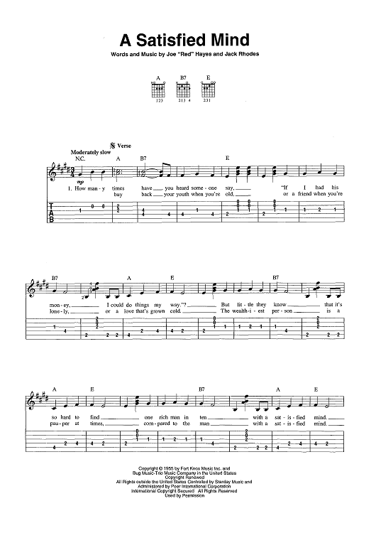 Digital Sheet Music for A Satisfied Mind by Joe 'Red' Hayes, Jack Rhodes scored for Easy Guitar Tab/Vocal/Chords; id:456815