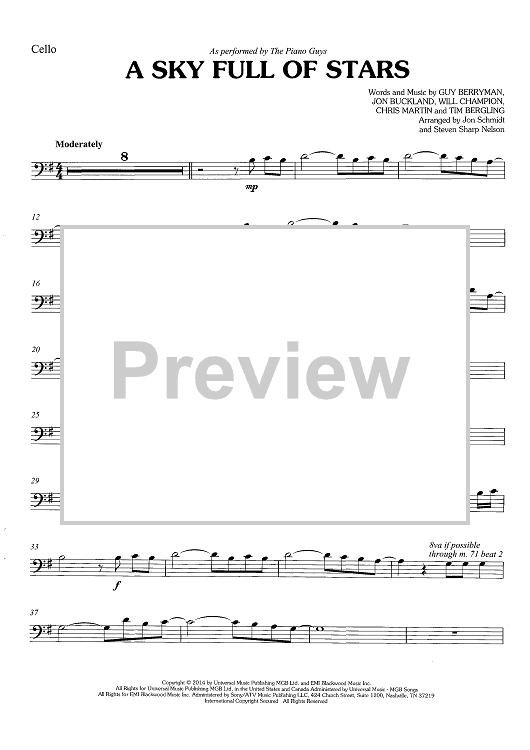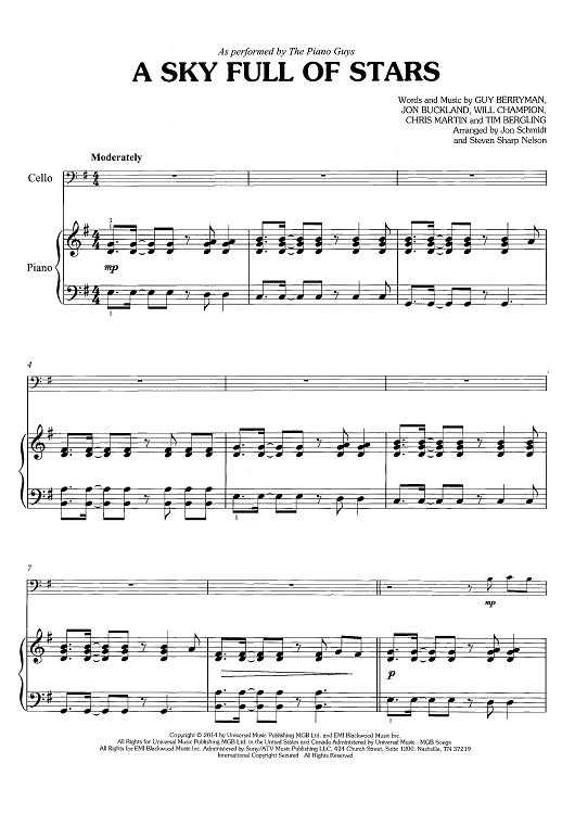 Digital Sheet Music for A Sky Full Of Stars by Chris Martin, Jonny Buckland, Guy Berryman, Jon Schmidt, Tim Bergling, Steven Sharp Nelson, The Piano Guys scored for Cello and Piano; id:465583