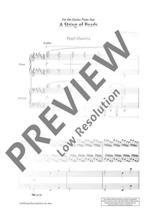 A String of Pearls is a five-movement suite for piano duet. Written in 2017 for the Darina Piano Duo, the duet is intended for pianists who particularly enjoy playing expressive and evocative music with a hint of minimalism. The minimalist style is often associated with music featuring repetitive structures or note patterns. Each movement represents a different pearl, reflecting the precious jewel’s characteristics as well as its corresponding symbolism.