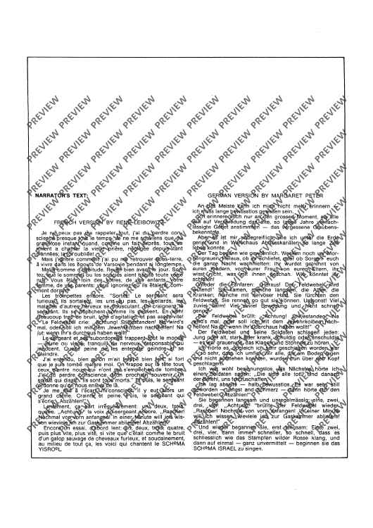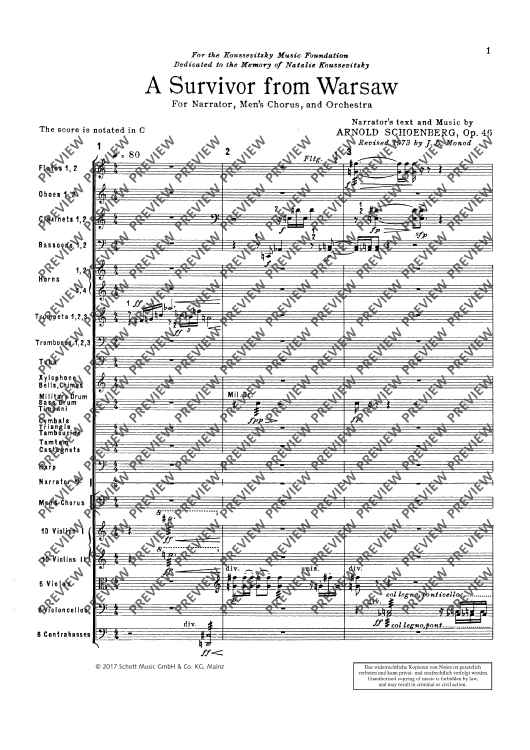 Shortly after the war, Schoenberg composed in his 99-bar monumental work depicting the suffering and oppression of an entire people. The story written by the composer himself describes the terror of the Nazi regime by example of a typical scene in the Warsaw Ghetto. In the concluding part of the men's choir, Schoenberg draws on the Jewish Creed in a depressing manner. The close connection of the music with the text makes this work an important post-war composition which is now also available as study score.