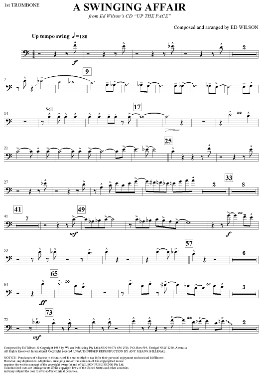Digital Sheet Music for A Swinging Affair - Trombone 1 by Ed Wilson, The Ed Wilson Big Band scored for Jazz Ensemble; id:311023