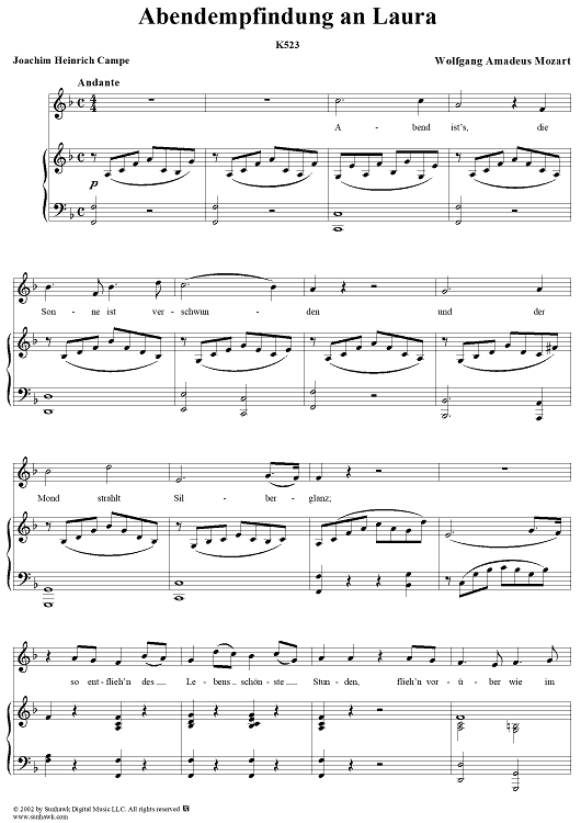 Digital Sheet Music for Abendempfindung an Laura, K523 by Wolfgang Amadeus Mozart, Joachim Heinrich Campe scored for Voice/Piano; id:291366