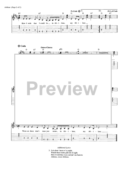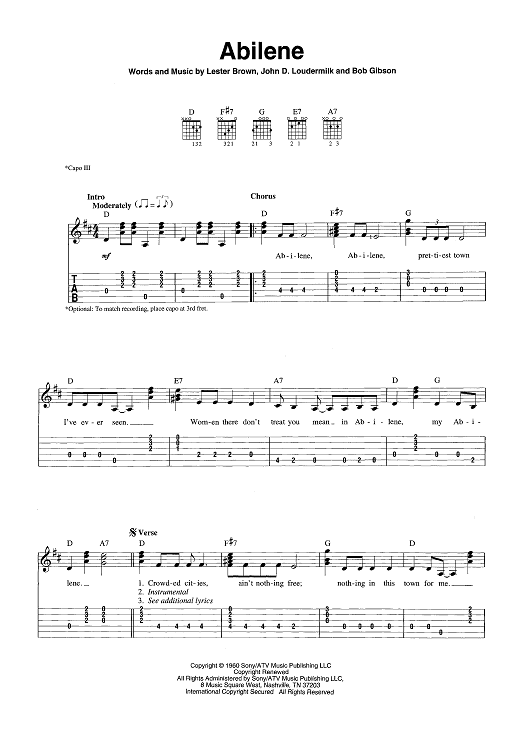 Digital Sheet Music for Abilene by John D. Loudermilk, Lester Brown, Bob Gibson, George Hamilton IV scored for Easy Guitar Tab/Vocal/Chords; id:456708