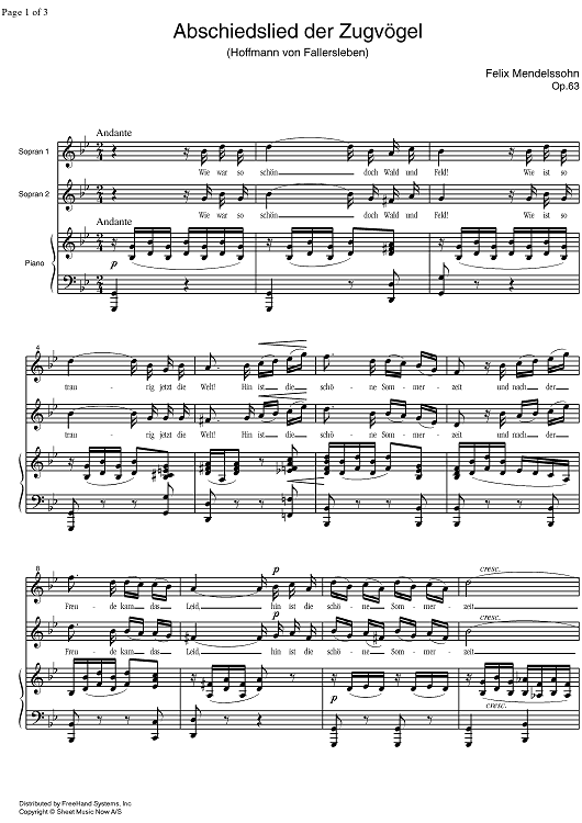 Digital Sheet Music for Abschiedslied der Zurvögel by Felix Mendelssohn scored for Two Sopranos/Piano; id:329474