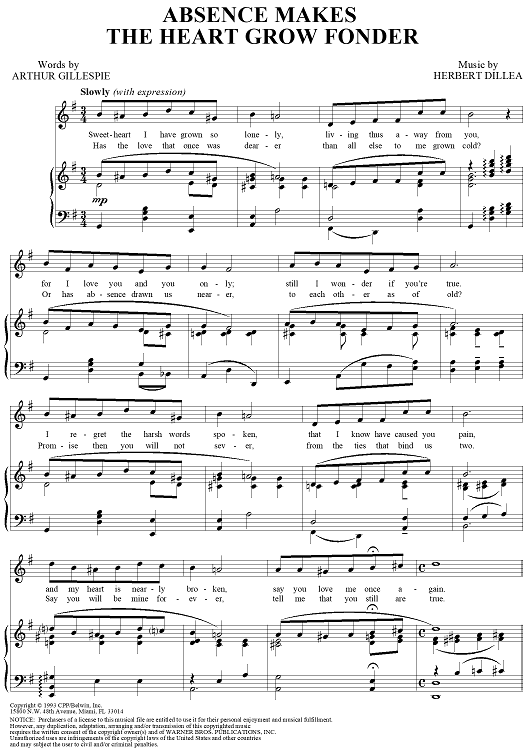 Digital Sheet Music for Absence Makes The Heart Grow Fonder by Herbert Dillea, Arthur Gillespie scored for Piano/Vocal; id:241651