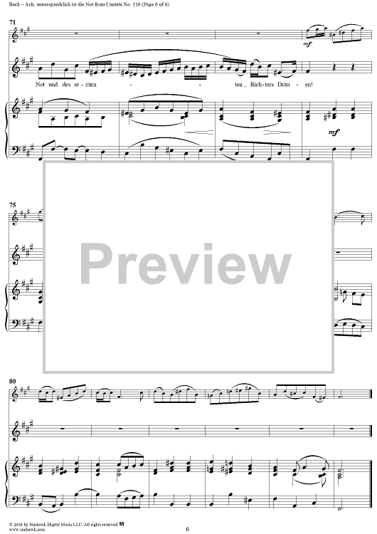 Digital Sheet Music for "Ach, unaussprechlich ist die Not", Aria, No. 2 from Cantata No. 116: "Du Friedefürst, Herr Jesu Christ" - Piano Score by Johann Sebastian Bach scored for Alto, Oboe d'amore and Piano or Organ; id:303906