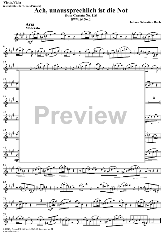 Digital Sheet Music for "Ach, unaussprechlich ist die Not", Aria, No. 2 from Cantata No. 116: "Du Friedefürst, Herr Jesu Christ" - Violin by Johann Sebastian Bach scored for Alto, Oboe d'amore and Piano or Organ; id:303908