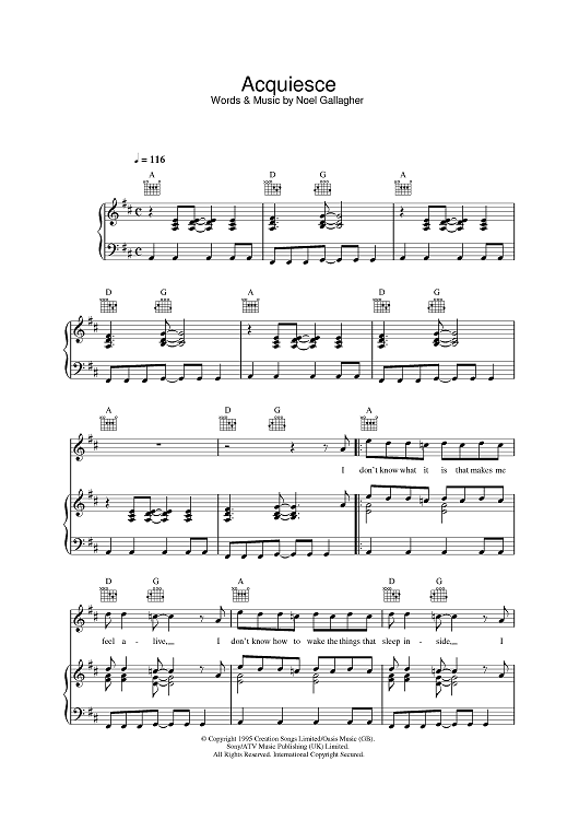 Digital Sheet Music for Acquiesce by Noel Gallagher, Oasis scored for Piano/Vocal/Chords; id:385586