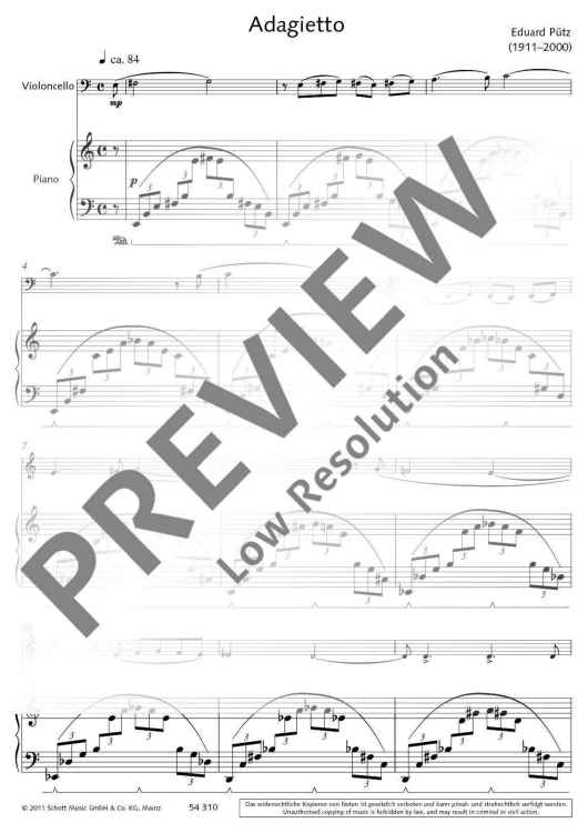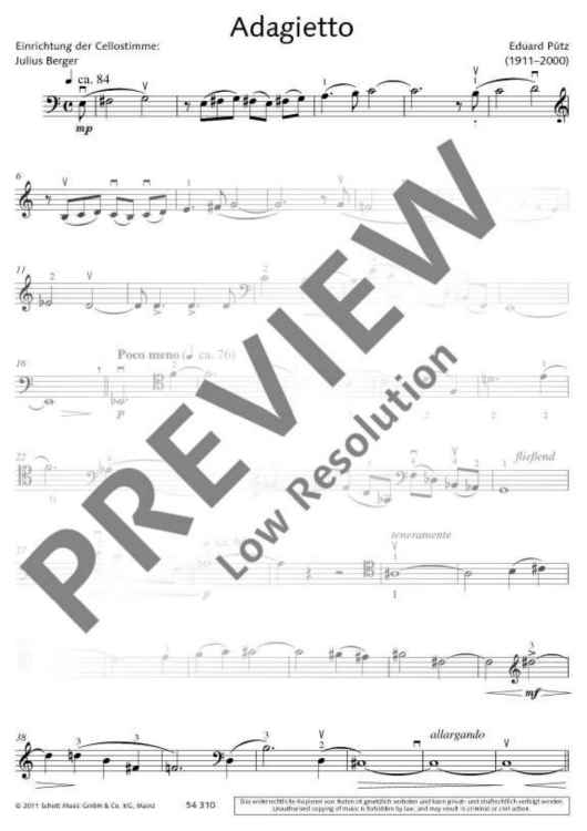 Eduard Pütz (1911-2000) studied with Heinrich Lemacher and Hermann Schroeder at the Cologne Musikhochschule and later worked as a music teacher at the grammar school in Rheinbach near Bonn as well as a composition teacher at the Rhenish Music School in Cologne. Overcoming the boundaries between serious and entertaining music was what mattered to him which is why he wrote many works which tried to combine jazz and new music. His 'Adagietto' for violoncello and piano (1990) was discovered within the composer's estate and published for the first time. Prof. Julius Berger arranged the piece for practical playing, adding appropriate fingerings. A short performance piece with interesting harmonies and arpeggios in the piano part and expressive cantilenas in the cello part.