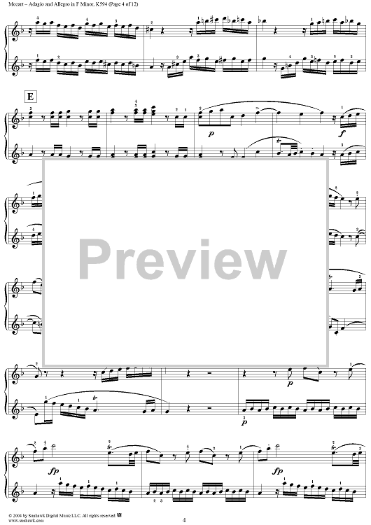 Digital Sheet Music for Adagio and Allegro in F Minor, K594 by Wolfgang Amadeus Mozart scored for 1 Piano, 4 Hands; id:294582