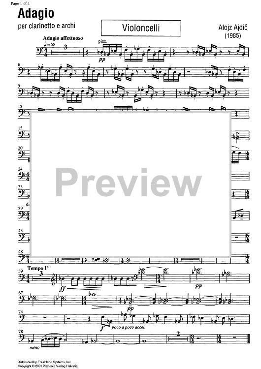 Digital Sheet Music for Adagio - Cello by , Alojz Ajdic scored for Clarinet/2 Violins/Viola/Cello/Double Bass; id:336379