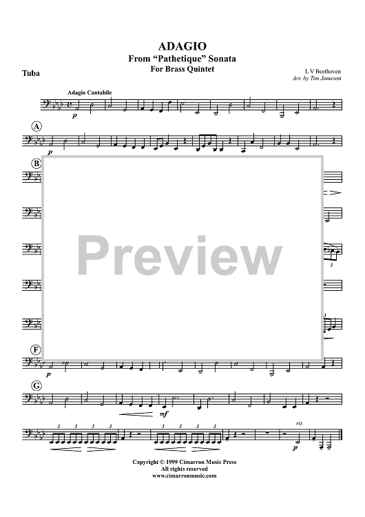 Digital Sheet Music for Adagio from "Pathetique" Sonata - Tuba by Ludwig van Beethoven, Tim Jameson scored for Brass Quintet; id:320407