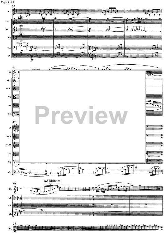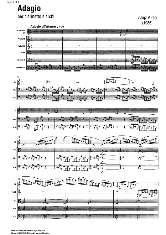 Digital Sheet Music for Adagio - Score by , Alojz Ajdic scored for Clarinet/2 Violins/Viola/Cello/Double Bass; id:336374