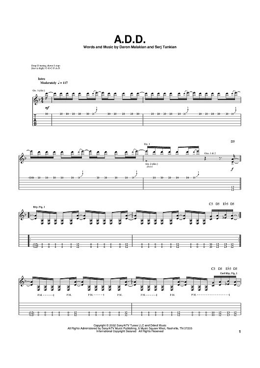 Digital Sheet Music for A.D.D. by Daron Malakian, System Of A Down, Serj Tankian scored for Guitar Tab; id:370640