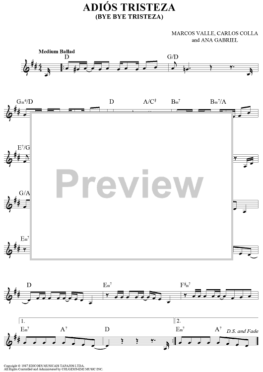 Digital Sheet Music for Adiós Tristeza (Bye Bye Tristeza) by Ana Gabriel, Marcos Valle, Carlos Colla scored for Lead Sheet; id:444966