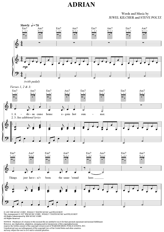 Digital Sheet Music for Adrian by Jewel, Steve Poltz, Jewel Kilcher scored for Piano/Vocal/Chords; id:311746