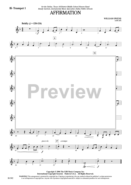 Digital Sheet Music for Affirmation - Bb Trumpet 1 by William Owens scored for Concert Band; id:500318