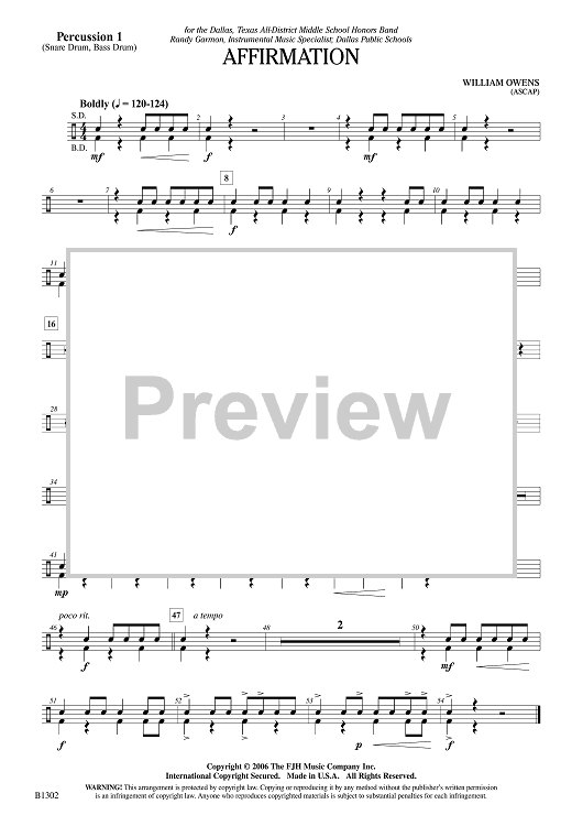 Digital Sheet Music for Affirmation - Percussion 1 by William Owens scored for Concert Band; id:500327