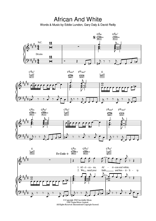 Digital Sheet Music for African And White by China Crisis, Gary Daly, Eddie Lundon, David Reilly scored for Piano/Vocal/Chords; id:398809