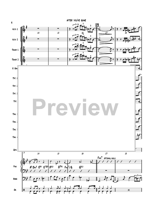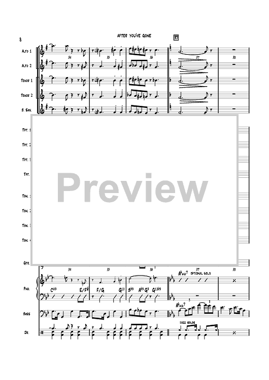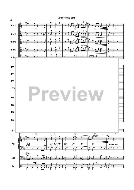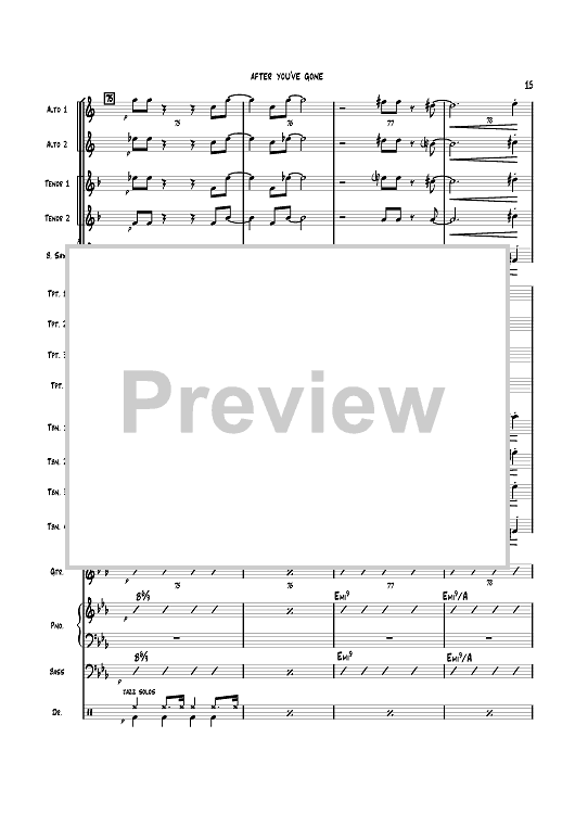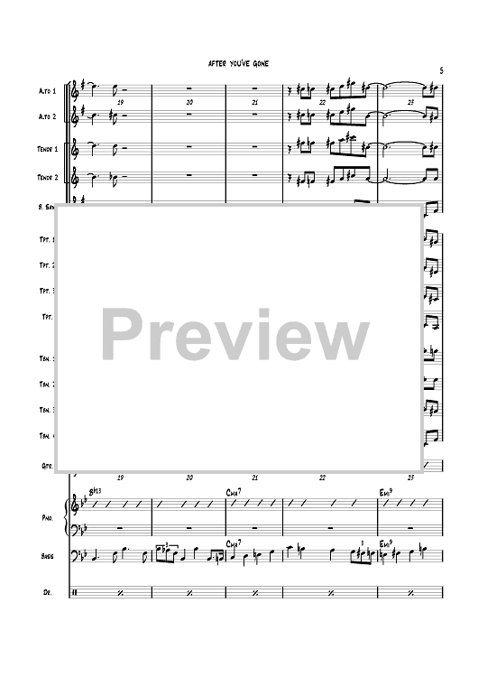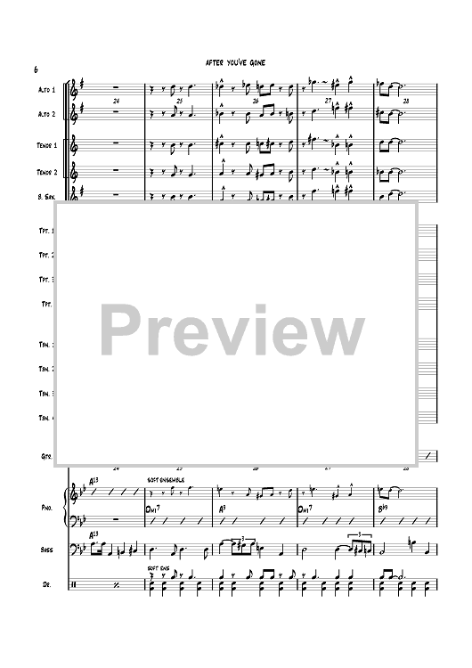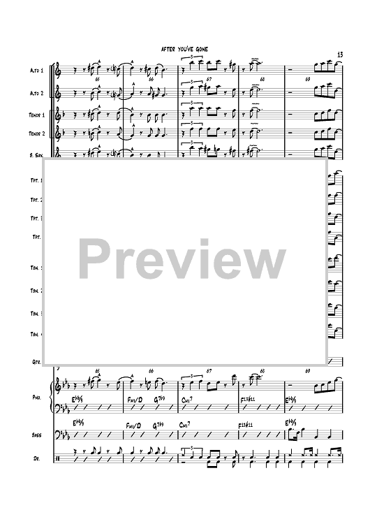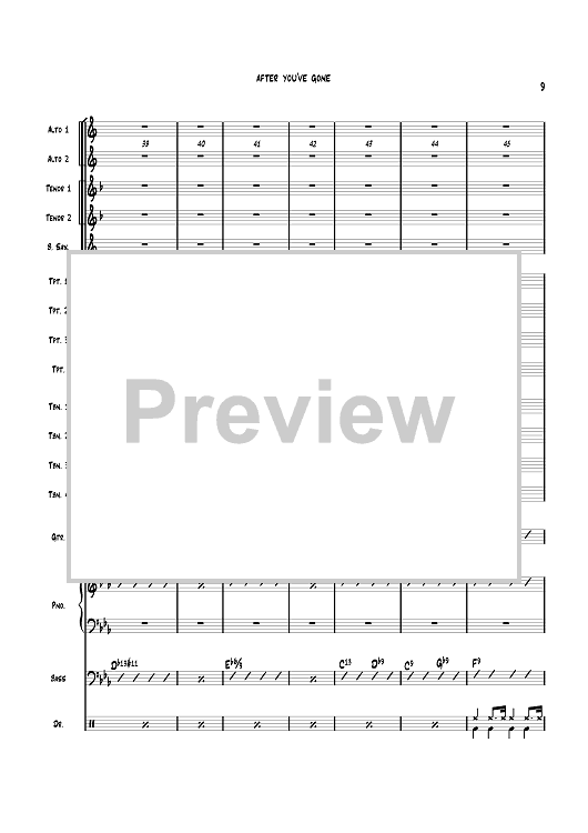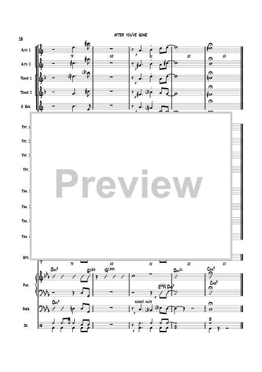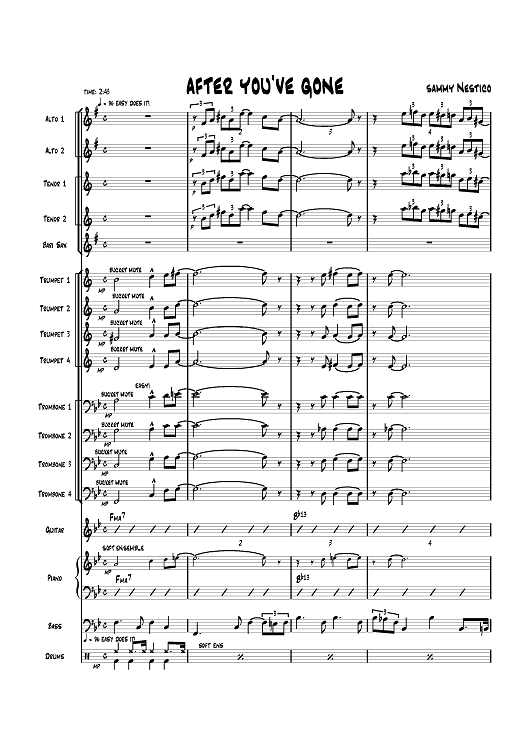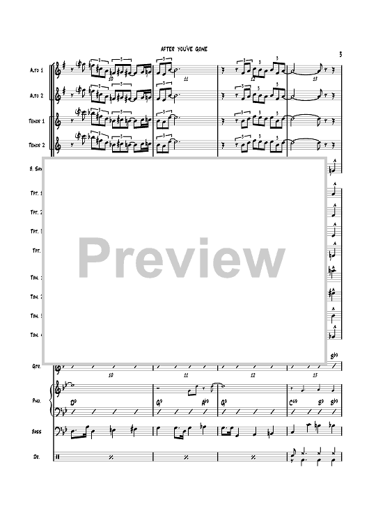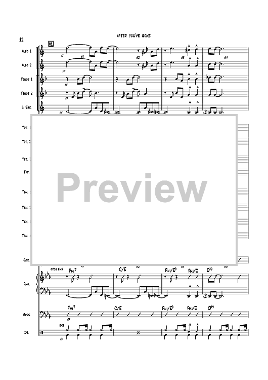 After You've Gone is very “laid-back” and easy for the first chorus. Use Guitar, Piano or your choice of instruments for the jazz sections. Drums should build up a bar before the ensemble at 61. The ensemble should be BIG!! From 75 to the end should be very light for a large contrast.