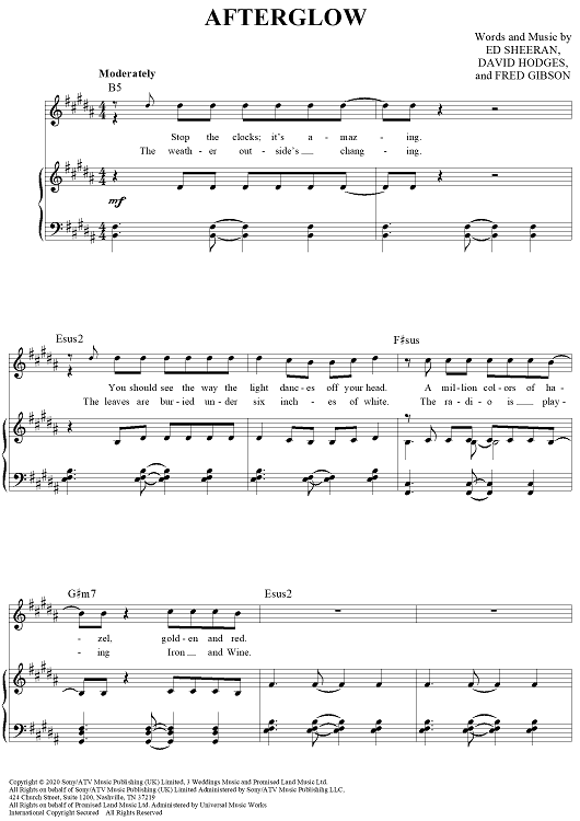 Digital Sheet Music for Afterglow by David Hodges, Ed Sheeran, Fred Gibson scored for Piano/Vocal/Chords; id:468789