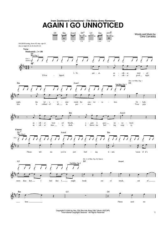 Digital Sheet Music for Again I Go Unnoticed by Chris Carrabba, Dashboard Confessional scored for Guitar Tab; id:380529