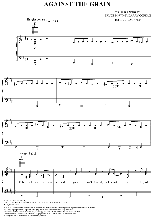Digital Sheet Music for Against the Grain by Garth Brooks, Bruce Bouton, Larry Cordle, Carl Jackson scored for Piano/Vocal/Chords; id:119228